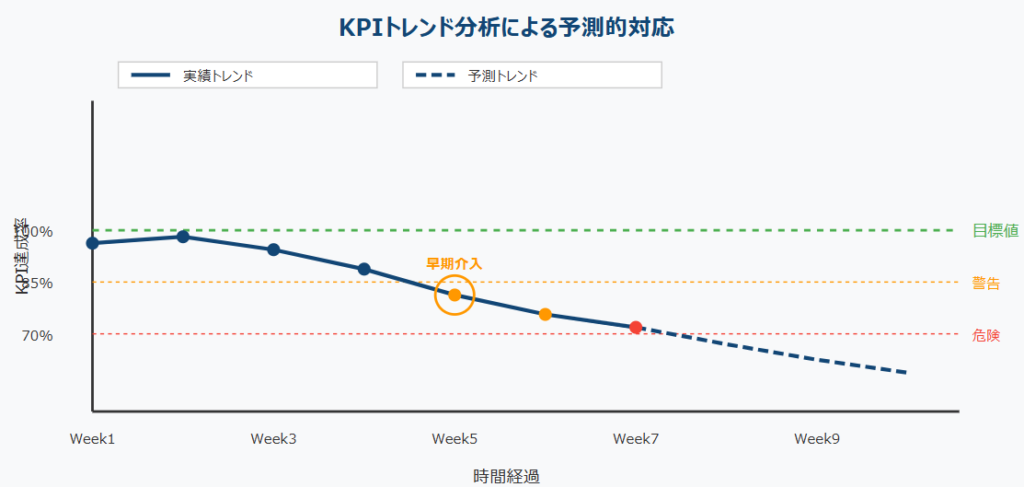 - 閾値アラート:KPIが警告ラインに近づいた時点で早期介入